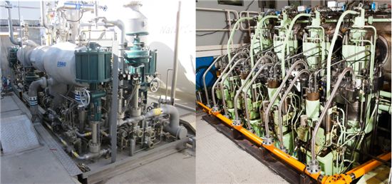 대우조선해양이 독자 개발한 고압 천연가스 연료 공급 장치(HP-FGS)(왼쪽)와 만 디젤 & 터보가 개발한 가스분사식(ME-GI) 엔진