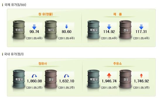 9월 4주 원유, 제품 가격이 하락하고 있으나 이날 한국 주유소의 가격은 9월 3주차 ℓ당 1946.74보다 더 올라 2034.45원으로 거래되고 있다. [유가정보서비스 : 오피넷 자료]