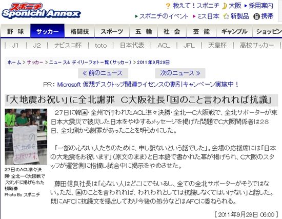 [스포츠투데이 조범자 기자]"모든 전북 서포터스가 그렇지 않겠지만 국가를 언급했기 때문에 항의하지 않을 수 없었다."일본 J리그 세레소 오사카가 한국 프로축구 전북 현대의 일부 서포터스가 내건 '일본 대지진 축하'의 악의적인 현수막에 대해 다시한번 입장을 밝혔다.일본 스포츠지 스포츠닛폰은 29일 전북 현대가 악의적인 걸개에 대해 세레소 오사카 측에 공식 사과했다고 보도했다. 이 매체는 "전북이 일부 철없는 팬들의 행동에 대해 사죄한다는 내용이었다"고 전했다.세레소 오사카의 후지타 아키라 사장은 이에 대해 "철없는 사람들은 어디에도 있고, 또 모든 전북 서포터스가 그렇지는 않을 것이다"면서 "단지 국가를 언급했기 때문에 우리로서는 항의하지 않으면 안됐다"고 말했다.전북의 일부 팬들은 지난 27일 전주월드컵경기장에서 열린 세레소 오사카와 아시아축구연맹(AFC) 챔피언스리그 8강 2차전 때 '일본의 대지진을 축하합니다(日本の大地震をお祝います)'라고 적힌 종이 플래카드를 관중석에 걸었다.이를 발견한 세레소 오사카 관계자들의 항의에 의해 플래카드는 바로 제거됐지만, 세레소 오사카 측은 AFC에 항의문을 제출했다.전북은 29일 공식 홈페이지를 통해 "일부 팬들의 불미스러운 행동으로 물의를 일으킨 점에 전북 현대를 사랑하고 축구를 사랑하는 팬들에게 머리 숙여 사과드린다"며 "이번 일은 일부 팬들의 비뚤어진 생각 때문에 벌어진 일로 기쁨을 만끽해야 할 지금 저희 구단은 더욱 큰 어려움과 아픔을 겪고 있다. 이번 일로 실의에 빠진 일본 국민과 축구팬들에게 심심한 사과의 말씀을 전하며 앞으로 이런 일이 다시는 일어나지 않도록 더욱 노력하겠다"고 강조했다.스포츠닛폰은 "(전북의 사과가 있지만) 이미 항의문을 제출했기 때문에 향후 처분은 AFC의 결정에 달려 있다"고 전했다.스포츠투데이 조범자 기자 anju1015@<ⓒ아시아경제 & 재밌는 뉴스, 즐거운 하루 "스포츠투데이(stoo.com)">
