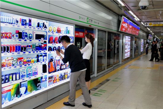 ▲홈플러스가 세계 최초로 선보인 가상스토어가 세계인의 이목을 집중시키고 있다. 사진은 서울 지하철 2호선 선릉역의 스크린도어에 설치된 가상스토어를 이용하는 시민들의 모습.