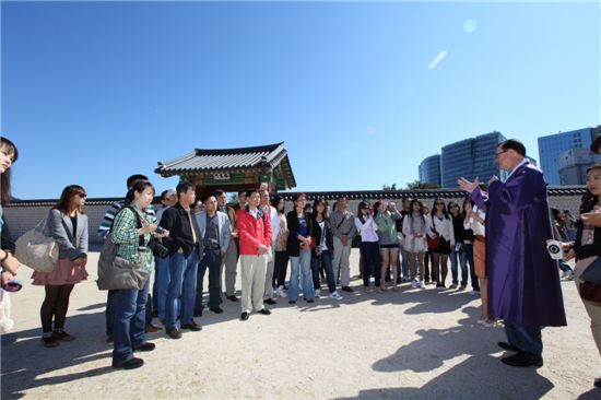 [아시아경제 조용준 기자]중국 최대 연휴인 국경절을 맞아 많은 중국 관광객이 한국을 찾고 있다. 한국관광공사 이 참 사장은 30일 오전 경복궁에서 1일 관광가이드로 변신, 중국인 관광객에게 한국의 아름다움을 선보였다. <ⓒ세계를 보는 창 경제를 보는 눈, 아시아경제(www.asiae.co.kr) 무단전재 배포금지>