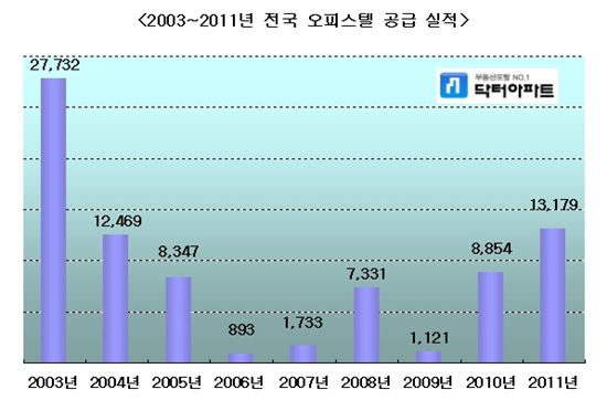 [아시아경제 조민서 기자]올 들어 3분기까지 전국에서 분양된 오피스텔 물량이 8년만에 최대치를 기록했다. 부동산정보업체 닥터아파트가 올해 1월부터 9월까지 전국에 분양된 오피스텔을 조사한 결과 총 1만3179실(48곳)이다. 2003년 이후 최대 물량이다. 전국 오피스텔 공급물량은 2003년에 2만7732실(1~12월)로 최대치를 기록했다. 이후 줄기 시작해 2004년 1만2469실, 2005년 8347실 심지어 2006년에는 893실 밖에 공급되지 않았다. 2004년 6월 오피스텔의 바닥 난방이 금지되면서 수요감소와 함께 공급량도 줄어든 것으로 분석된다. 하지만 2006년 11월 전용면적 15평이하 오피스텔의 바닥 난방이 다시 허용되면서 공급량도 늘었다. 2007년 1733실, 2008년 7331실, 2009년 1121실, 2010년 8854실이 공급됐다. 특히 2010년 아파트값이 약세를 면치 못하면서 수요자들의 관심이 임대수익이 가능한 부동산 상품으로 쏠리면서 수요가 크게 늘었다. 실제 2010년 10월 역삼동에 공급된 강남역 서희 스타힐스의 경우 234실 공급에 총 1245명이 청약하면서 평균 5대 1의 경쟁률을 기록했다. 같은 해 10월 서초동에서 공급된 강남역아이파크 오피스텔 역시 32대1(230실 공급, 7521명 청약)의 경쟁률로 단숨에 분양을 마첬다. 이런 오피스텔의 분양 열기는 2011년도 이어가고 있다. 올해 오피스텔 공급은 지난 1월 534실 공급을 시작으로 매월 공급량이 늘기시작해 3월에는 올해 최대치인 3152실이 공급됐으며 5월과 6월에도 각각 2188실과 2422실을 꾸준히 공급됐다. 지난 1월 마포구 대흥동에서 공급된 이대역 푸르지오는 총 362실 모집에 4951명이 청약하면서 평균 13대 1의 경쟁률을 기록하며 청약을 마쳤다. 5월 성남시 판교에서 분양에 나섰던 판교역KCC웰츠타워 역시 13대 1의 경쟁률(256실 공급, 3500명 이상 청약)을 기록했다. 비슷한 시기에 공급된 판교역 효성 인테리안 오피스텔 역시 23대 1의 경쟁률(221실 공급, 5300명 이상 청약)을 보였다. 8월 들어 분양물량이 다시 늘기 시작해 1406실이 공급됐으며 9월 현재도 1130실이 분양됐다. 지역적으로 서울에서 6609실이 공급되며 최대를 기록했으며 경기(2995실), 부산(1564실), 인천(1368실), 울산(544실), 대구(99실)시 순으로 공급이 많았다. 이영호 닥터아파트 리서치연구소 소장은 "2010년 이전만 해도 오피스텔만 공급하던 것에서 벗어나 최근 오피스텔과 도시형생활주택이 같이 지어지고 있는 만큼 올해 오피스텔 공급이 2003년 수준을 넘을 것 같지 않다"라며 "여전히 아파트 시장이 침체를 보이는 만큼 오피스텔 인기는 올 하반기까지 이어질 것"이라고 했다. 조민서 기자 summer@<ⓒ세계를 보는 창 경제를 보는 눈, 아시아경제(www.asiae.co.kr) 무단전재 배포금지>