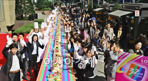 [아시아경제 이재문 기자]3일 오전 서울 중구 롯데백화점 정문 앞에서 고객들과 관계자들이 롯데백화점 창립 32주년을 기념해 제작된 32m 롤케이크를 자르고 있다. 이번에 롯데백화점에서 선보인 롤케이크는 기네스 월드 레코드에 등재된 20.11m의 롤케이크(일본 시부야) 이후 세계 최대 크기이다.이재문 기자 moon@<ⓒ세계를 보는 창 경제를 보는 눈, 아시아경제(www.asiae.co.kr) 무단전재 배포금지>