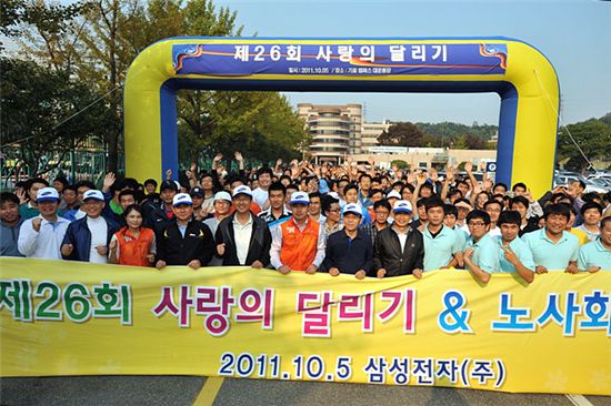 5일 삼성전자 기흥캠퍼스에서 열린 '제26회 사랑의 달리기 행사'에 참가한 임직원들이 출발 전 화이팅을 외치고 있다.<br /> <br />