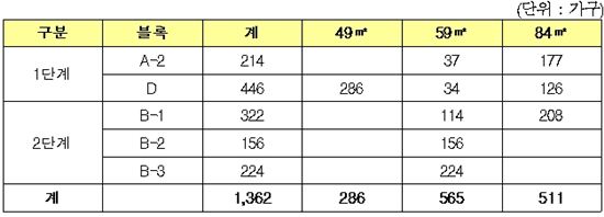 [아시아경제 박충훈 기자]LH(한국토지주택공사)는 세종시 첫마을에서 10년 공공임대아파트 1362가구를 공급한다.1단계 지역에 전용면적 49㎡ 286가구, 59㎡ 71가구, 84㎡ 303가구 등 총 660가구가 공급된다. 2단계는 전용면적 59㎡ 494가구, 84㎡ 208가구 등 702가구가 공급된다.세종시 첫마을 공공임대아파트 공급현황.