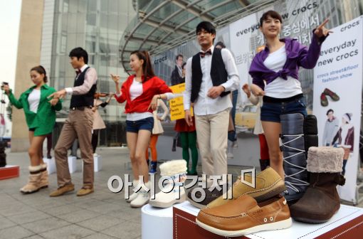 [아시아경제 이재문 기자]라이프 스타일 슈즈 크록스가 6일 서울 청계광장에서 더욱 스타일리시해진 2011년 가을.겨울 신제품을 소개하는 크록스 스트리트 & 플로어 패션쇼를 진행하고 있다.이재문 기자 moon@<ⓒ세계를 보는 창 경제를 보는 눈, 아시아경제(www.asiae.co.kr) 무단전재 배포금지>