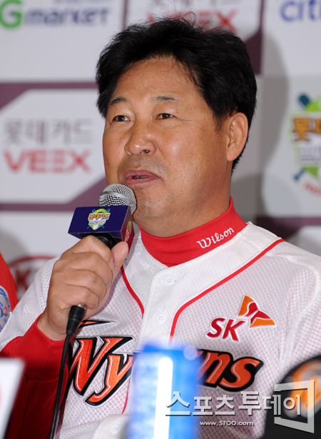 [인천=스포츠투데이 정재훈 기자] 7일 오후 문학야구장 1루 내야 1층 로비에서 2011 롯데카드 프로야구 준플레이오프 미디어데이가 열렸다. 이만수 SK 감독대행이 준플레이오프를 앞둔 각오를 밝히고 있다.스포츠투데이 정재훈 사진기자 roze@<ⓒ아시아경제 & 재밌는 뉴스, 즐거운 하루 "스포츠투데이(stoo.com)">