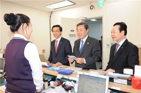 7일 맹형규 행정안전부 장관과 이인기 국회 행정안전위원회위원장은 국회 직장 새마을금고를 찾아 각각 100만원씩 자립예탁금에 가입했다. (사진 왼쪽부터 이인기 행정안전위원회위원장, 맹형규 행정안전부 장관, 신종백 새마을금고연합회장) / 행정안전부<br />