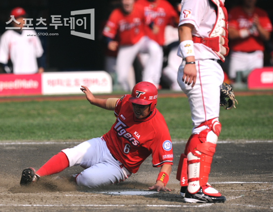 [인천=스포츠투데이 정재훈 기자] 8일 오후 문학야구장에서 열린'2011 롯데카드 프로야구' SK 와이번스와 KIA 타이거즈의 준플레이오프 1차전 3회초 김선빈의 희생플라이에 박기남이 홈인하며 첫 득점을 올리고 있다. 스포츠투데이 정재훈 사진기자 roze@<ⓒ아시아경제 & 재밌는 뉴스, 즐거운 하루 "스포츠투데이(stoo.com)">