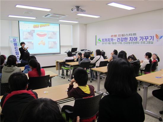 [아시아경제 박종일 기자]은평구(구청장 김우영)는 지난 7일 드림스타트 사업의 저소득층 아동 32명을 대상으로 신사2동 주민센터에서 구강건강 교실을 열었다.치아 전문보건교육 교사의 강의로 진행된 이날 교육은 구강건강 지식을 전달하고 올바른 칫솔질을 생활화해 아이들이 평생 건강한 구강을 유지하도록 하기 위해 마련 됐다. 한 시간 동안 진행된 교육은 음식물 찌꺼기가 충치를 발생시키는 과정과 그 예방법을 알아보고 치아에 남아있는 치석을 직접 확인하는 과정을 통해 올바른 칫솔질의 중요성을 깨닫는 등 다양하게 구성 돼 참가 아동과 부모들의 큰 호응을 받았다.