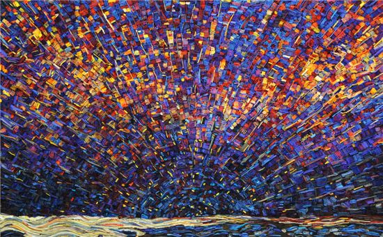 공예적인 요소로서의 퀼링(Quilling)기법을 회화를 넘어서 조각적인 기법으로 그는 화면을 구축하고 있다. 이는 관람자에게 가벼움보다는 무거움을 확산보다는 응축을 느끼게 한다.Layer-The Church at Auvers, 72.7x60.6cm Paper stack, 2011<br />
