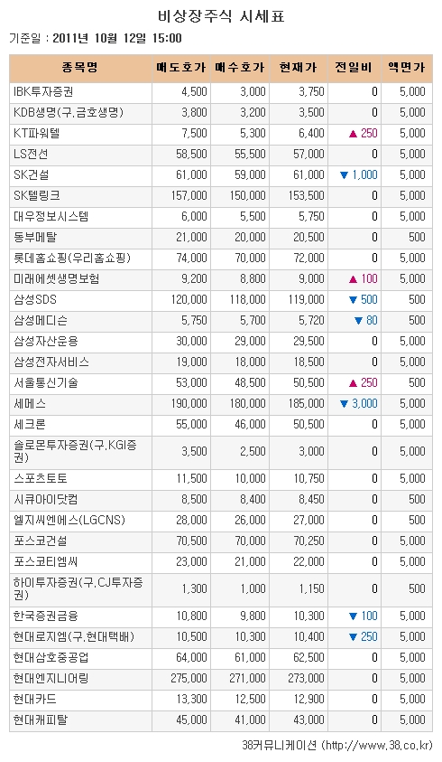 [아시아경제 천우진 기자] 12일 비상장주식 시장은 공모주 강세에도 불구하고 전체적으로는 하락세로 돌아섰다.기업공개(IPO) 관련주로 오는 14일 코스피 상장 예정인 태양광 발전용 웨이퍼 생산업체 넥솔론이 5550원(+14.43%)으로 이틀 연속 급등했다. 오는 17일 코스닥 상장 예정인 산업용로봇 생산업체 로보스타도 7650원(+7.75%)으로 이틀간 강세를 보였다. 오는 13일 공모 청약 예정인 물질검사 장비업체 케이맥은 1만8750원(+8.38%)으로 급등했다.오는 20일 공모 예정인 반도체 열처리 장비업체 테라세미콘과 이달 27일 공모 예정인 창고 자동화 시스템업체 신흥기계도 각각 1만8200원(+5.20%), 1만900원(+9.00%)으로 올랐다. 공모 일정이 연기된 음반 제작업체 와이지엔터테인먼트는 6만1750원(+1.23%)으로 상승했으나 다음달 1일 공모 예정인 반도체업체 테크윙은 1만9700원(-1.99%)으로 밀려났다.상장 승인 기업으로 서버보안 솔루션업체 시큐브가 3500원(-2.78%)으로 하루 만에 하락했다. 사파이어잉곳 제조업체 사파이어테크놀로지는 7만3000원(+2.10%)으로 6거래일 연속 올라 5주 최고가를 경신했다. 심사 청구 기업으로는 터보엔진 제품 제조업체 뉴로스가 9500원(+0.53%)으로 하루 쉬고 다시 상승세를 이어갔다.삼성 관련주로는 홈 네트워크 전문기업 서울통신기술이 5만500원(+0.50%)으로 4거리일 연속 올랐다. 반도체 세정장비업체 세메스와 정보통신기술(ICT) 서비스기업 삼성SDS는 각각 18만5000원(-1.60%), 11만9000원(-0.42%)으로 내렸다. 의료기기 제조업체 삼성메디슨은 5720원(-1.38%)으로 이틀 연속 내렸다.건설업체 SK건설과 반도체 및 전자부품 제조업체 테스나는 각각 6만1000원(-1.61%), 7250원(-3.33%)으로 테스나가 다시 최저가를 갈아치웠다. 현대그룹 종합물류기업 현대로지엠은 1만400원(-2.35%)으로 내려 3거래일 동안 약세가 이어졌다.그밖에 주파수공용통신(TRS) 사업자 KT파워텔과 애니메이션 제작업체 오콘이 각각 6400원(+4.07%), 4200(+1.20%)으로 올랐다. 커피 가공업체 카페베네와 증권담보 대출 업체 한국증권금융은 각각 1만5000원(-3.23%), 1만300원(-0.96%)으로 하락하며 장을 마감했다.자료제공: