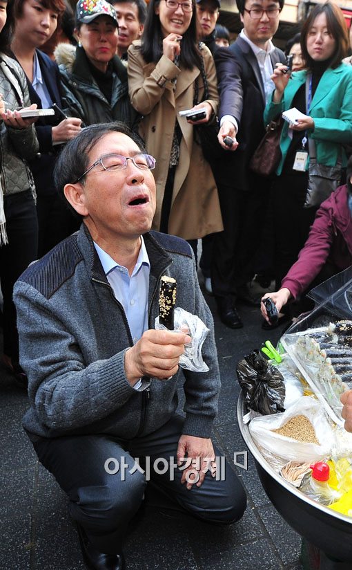 [아시아경제 윤동주 기자] 10.26 재보선 공식선거운동이 시작된 13일 오전 서울 남대문시장을 찾은 박원순 범 야권 서울시장 후보가 김밥을 먹고 있다.윤동주 기자 doso7@<ⓒ세계를 보는 창 경제를 보는 눈, 아시아경제(www.asiae.co.kr) 무단전재 배포금지>