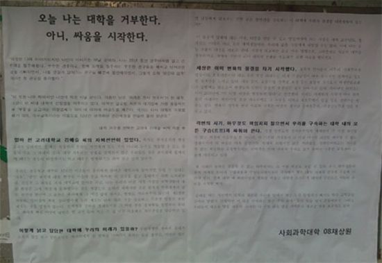 서울대 교내에 뭍은 자퇴 선언 대자보