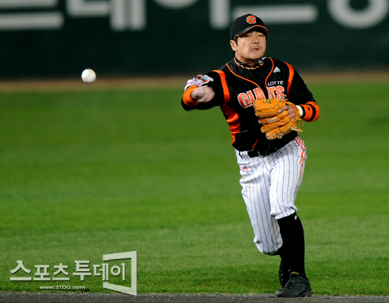[인천=스포츠투데이 정재훈 기자] 19일 오후 문학야구장에서 열린 '2011 롯데카드 프로야구 플레이오프 3차전' SK 와이번스와 롯데 자이언츠의 경기 2회말 문규현이 최동수의 타구를 잡아 1루로 송구하고 있다. 스포츠투데이 정재훈 사진기자 roze@<ⓒ아시아경제 & 재밌는 뉴스, 즐거운 하루 "스포츠투데이(stoo.com)">