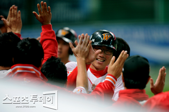 [인천=스포츠투데이 정재훈 기자] 19일 오후 문학야구장에서 열린 '2011 롯데카드 프로야구 플레이오프 3차전' SK 와이번스와 롯데 자이언츠의 경기 8회말 김강민의 좌중간 1루타에 홈을 밟은 최정과 박정권이 동료들과 하이파이브하고 있다. 스포츠투데이 정재훈 사진기자 roze@<ⓒ아시아경제 & 재밌는 뉴스, 즐거운 하루 "스포츠투데이(stoo.com)">