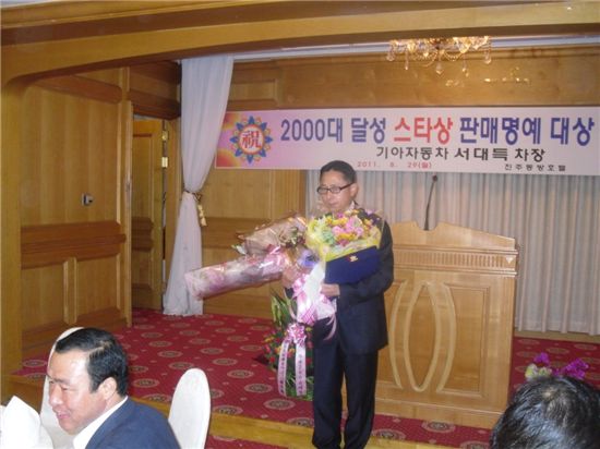 서대득 기아차 차장 지난 8월 누적판매 2000대 달성을 기념해 상패를 받고 있다.