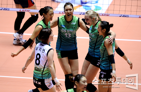 [스포츠투데이 정재훈 기자] 27일 오후 서울 장충체육관에서 'NH 농협 2011-2012 V리그' 여자부 GS칼텍스와 KGC 인삼공사의 경기에서 득점에 성공한 GS칼텍스 선수들이 기뻐하고 있다.스포츠투데이 정재훈 사진기자 roze@<ⓒ아시아경제 & 재밌는 뉴스, 즐거운 하루 "스포츠투데이(stoo.com)">정재훈 사진기자 roze@<ⓒ아시아 대표 석간 '아시아경제' (www.newsva.co.kr) 무단전재 배포금지>