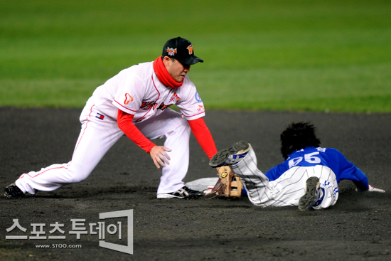 [인천=스포츠투데이 정재훈 기자] 28일 오후 문학 야구장에서 열린 '2011 롯데카드 프로야구' SK 와이번즈와 삼성라이온즈의 한국시리즈 3차전 3회초 배영섭이 2루 도루에 성공하고 있다.스포츠투데이 정재훈 사진기자 roze@<ⓒ아시아경제 & 재밌는 뉴스, 즐거운 하루 "스포츠투데이(stoo.com)">