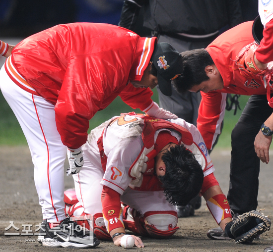[인천=스포츠투데이 정재훈 기자] 28일 오후 문학 야구장에서 열린 '2011 롯데카드 프로야구' SK 와이번즈와 삼성라이온즈의 한국시리즈 3차전 4회초 이만수 감독대행이 그라운드에 쓰러진 정상호의 상태를 살피고 있다.스포츠투데이 정재훈 사진기자 roze@<ⓒ아시아경제 & 재밌는 뉴스, 즐거운 하루 "스포츠투데이(stoo.com)">