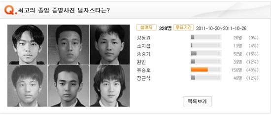 [아시아경제 오진희 기자] 졸업사진이 가장 잘나온 남자 스타로 배우 유승호가 1위를 차지했다.음악전문사이트 몽키3은 지난 20일부터 26일까지 '최고의 졸업사진 男스타'라는 주제로 설문조사를 실시했다. 그 결과 유승호가 총 328표 중 48%(156명)의 지지를 얻어 1위에 올랐다. 2위는 SBS '뿌리깊은 나무'에서 어린 이도 역을 맡아 인상적인 연기를 펼치고 있는 송중기가 선정됐다. 영화 '너는 펫'의 장근석은 3위를 차지했다. 이어 원빈(12%), 강동원(9%), 소지섭(4%) 순이었다. 이번 설문 결과를 접한 네티즌들은 "유승호 대박인데..?", "소지섭이 레전드 ㅋㅋㅋ"라는 반응을 보였다.오진희 기자 valere@<ⓒ세계를 보는 창 경제를 보는 눈, 아시아경제(www.asiae.co.kr) 무단전재 배포금지>