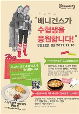 [아시아경제 오주연 기자] 패밀리레스토랑 베니건스가 2012학년도 대학수학능력시험을 치르는 수험생들을 위해 다양한 이벤트를 실시한다고 2일 밝혔다.