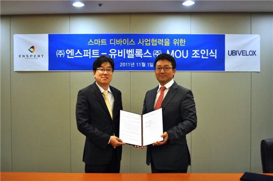 이창석 엔스퍼트 대표(사진 오른쪽)와 이흥복 유비벨록스 대표(왼쪽)가 태블릿PC 등 단말 사업 업무 제휴식을 맺고 있다.