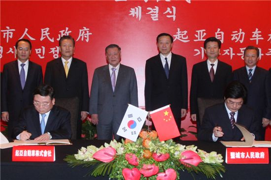 [아시아경제 최일권 기자] 기아자동차가 늘어나는 중국 자동차 산업수요에 대응하고 중국 시장 내 지속적인 시장 우위를 유지하기 위해 중국 제 3공장 건설을 결정하고 2일 오후(현지시간) 투자협의서를 체결했다.사진은 중국 장쑤성 난징시에 위치한 진링호텔에서 정몽구 현대차그룹 회장(뒷줄 좌측 세번째)을 비롯한 회사관계자와 장쑤성 뤄즈쥔 서기(뒷줄 좌측 네번째), 장쑤성 장웨이궈 부성장(뒷줄 우측 두번째), 옌청시 자오펑 서기(뒷줄 우측 첫번째) 등 관계자들이 참석한 가운데 이형근 기아차 부회장(앞줄 좌측)과 웨이궈창 옌청시 시장(앞줄 우측)이 ‘둥펑위에다기아 3공장 투자협의서’에 사인하고 있는 모습.최일권 기자 igchoi@<ⓒ세계를 보는 창 경제를 보는 눈, 아시아경제(www.asiae.co.kr) 무단전재 배포금지>