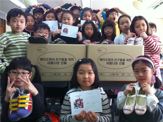 "에티오피아 친구들아 사랑해." 천일초등학교 학생들이 에티오피아에 보내려 가지고 온 신발과 편지 등을 들어보이고 있다. '에티오피아 친구들을 위한 아름다운 선물' 행사로 에티오피아에 전달되는 물품은 신발 1000여 켤레와 책걸상 3000조 등이다. 사진=경기도교육청 제공.