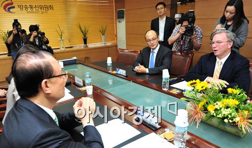 [아시아경제 윤동주 기자] 한국을 방문중인 에릭 슈미트 구글 회장이 7일 서울 방통위를 방문해 최시중 위원장과 환담을 나누고 있다.윤동주 기자 doso7@<ⓒ세계를 보는 창 경제를 보는 눈, 아시아경제(www.asiae.co.kr) 무단전재 배포금지>