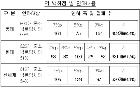 ▲각 백화점 별 수수료 인하내용. (자료 : 공정거래위원회)