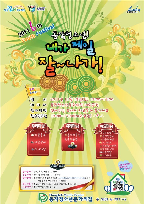 축제마당은 중고교 학생들이 주축이 된 댄스와 밴드동아리 6팀이 출연, 그동안 갈고 닦은 기량을 선보이면서 참석자들에게 즐거움과 볼거리를 제공할 예정이다.또 이 날 행사를 통해 청소년들을 위한 고민과 진로, 이성문제 등을 상담할 부스가 마련돼 청소년들이 갖고 있는 고민도 상담한다.이와 함께 지문인식을 통한 진로체험을 비롯해 자존감테스트. OX 퀴즈, 전래놀이 천연화장품만들기, 다문화 먹거리, 행운권 추첨 등 다양한 프로그램으로 청소년들과 구민들을 맞게 된다.동작청소년문화의 집 안남홍 관장은 “동작청소년 문화의집 개관 6주년을 맞아 청소년을 위한 행사를 마련했다”면서 “많은 청소년들이 참여해서 꿈과 희망의 날개를 마음껏 펼쳤으면 좋겠다”고 말했다. 박종일 기자 dream@<ⓒ세계를 보는 창 경제를 보는 눈, 아시아경제(www.asiae.co.kr) 무단전재 배포금지>