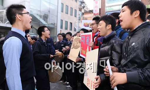 [아시아경제 양지웅 기자]2012학년도 수학능력시험이 실시된 10일 오전 서울 종로구 경복고등학교에서 학생들이 선배들을 향한 열띤 응원을 펼치고 있다.양지웅 기자 yangdoo@<ⓒ세계를 보는 창 경제를 보는 눈, 아시아경제(www.asiae.co.kr) 무단전재 배포금지>