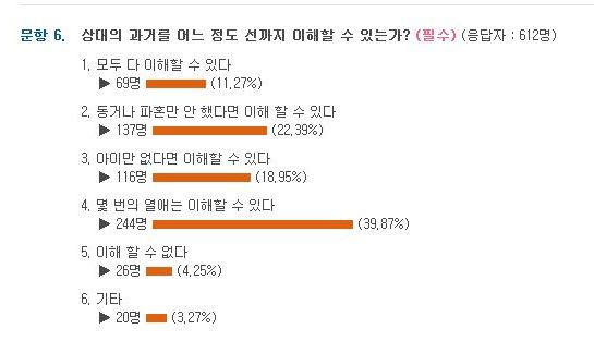 [아시아경제 오주연 기자] 결혼적령기 남녀들은 상대의 과거를 어느 선까지 이해해줄 수 있을까. 남녀 응답자의 절반 이상은 '동거나 파혼만 안했다면 수 차례 열애한 것까지는 묵인할 수 있다'고 답했다.결혼정보회사 아띠클럽이 남녀 612명을 대상으로 '결혼 상대방의 과거, 어느 정도 선까지 이해할 수 있는가'에 대해 설문한 결과, 응답자의 10명 중 4명(39.9%)이 '몇 번의 열애까지는 이해할 수 있다'고 답해 가장 많은 비율을 차지했다. 그 다음으로는 ▲동거나 파혼만 안 했다면 이해 할 수 있다(22.4%) ▲아이만 없으면 된다(18.9%) ▲모두 다 이해할 수 있다(11.3%) 순으로 나타났다.