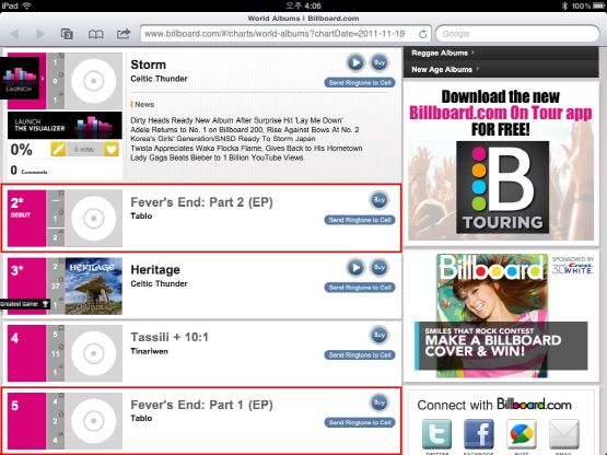 타블로가 최근 발표된 미국 빌보드 월드 앨범 차트에서 2위와 5위에 올랐다. 11월 19일자 빌보드 차트에 따르면 지난 11월 1일 발표된 타블로의 <열꽃> ‘Part 2’는 월드 앨범 차트에 2위에 올랐으며, ‘Part 1’은 5위를 기록했다. ‘Part 1’ 은 지난 12일자 차트에서는 4위를 기록한 바 있다. 빌보드 월드 앨범 차트에는 그동안 여러 가수들이 이름을 올렸지만, 한 가수가 TOP 10 안에 동시에 이름을 올린 것은 처음이다. 타블로의 <열꽃>은 북미 아이튠스 힙합 앨범 차트에서 이미 1위를 기록한 바 있다. 타블로는 12월 3일, 4일 개최되는 < YG 패밀리 콘서트 >의 무대에도 오를 예정이다.10 아시아 글. 김명현 기자 eighteen@<ⓒ즐거움의 공장 "10 아시아" (10.asiae.co.kr) 무단전재 배포금지>