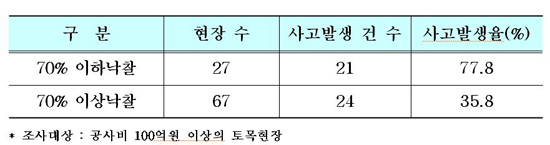 [아시아경제 이영철 기자] 저가낙찰업체의 공사현장에서 사고발생률이 높은 것으로 나타났다.한국철도시설공단(이사장 김광재)이 공단의 공사현장 중 저가낙찰현장의 안전사고 발생률이 일반낙찰 현장보다 2배 이상 높은 것으로 나타나 이들 현장에 대한 안전관리를 강화한다고 14일 밝혔다.공단은 최근 5년간 공사비 100억원 이상의 123개 현장을 대상으로 안전사고 발생현황을 살펴봤다.이 중 70%이하 저가낙찰 27개 현장에서 안전사고가 21건이 일어나 사고율이 77.8%로 나타났다.