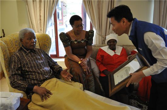 삼성전자 아프리카 총괄 박광기 전무(맨 오른쪽)가 넬슨 만델라 전 남아공 대통령 자택을 방문해 만델라 전 대통령(93)(맨 왼쪽)과 부인인 그라샤 마셸 여사(왼쪽에서 두번째)에게 '만델라 다목적 커뮤니티센터 완공 증명서'를 전달하고 있다. 삼성전자는 넬슨 만델라 전 대통령의 고향인 남아프리카 쿠누 지역에 지역 주민을 위한 도서관, 방과후 학교, 취업 스쿨 등 교육센터로 이용될 '만델라 다목적 커뮤니티센터'를 오픈했다.