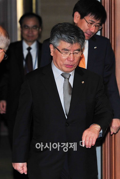 [아시아경제 윤동주 기자] 16일 서울 중구 남대문로 한국은행에서 열린 한은총재와 대기업CEO 간담회에 참석한 김중수 총재가 시계를 바라보며 간담회장으로 들어서고 있다.윤동주 기자 doso7@<ⓒ세계를 보는 창 경제를 보는 눈, 아시아경제(www.asiae.co.kr) 무단전재 배포금지>