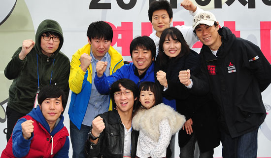 2011 아시아경제 연비왕 대회에 참가한 김현일(가운데 아래) 씨가 딸 김수아 양을 안고 동호회 사람들과 함께 포즈를 취하고 있다.