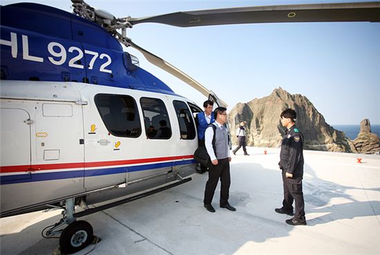 삼성전자 서비스 엔지니어들이 독도수비대의 시스템에어컨 점검 서비스를 위해 헬기를 이용해 독도에 들어가고 있다.<br /> <br />