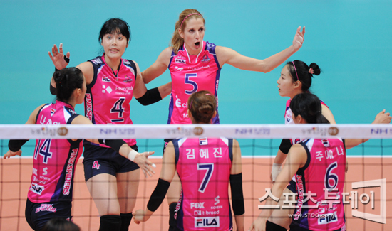 [인천=스포츠투데이 정재훈 기자] 22일 오후 인천 도원시립체육관에서 열린 'NH농협 2011-2012 V리그' 여자부 흥국생명과 도로공사의 경기에서 공격에 성공한 흥국생명 선수들이 환호하고 있다.스포츠투데이 정재훈 사진기자 roze@<ⓒ아시아경제 & 재밌는 뉴스, 즐거운 하루 "스포츠투데이(stoo.com)">정재훈 사진기자 roze@<ⓒ아시아 대표 석간 '아시아경제' (www.newsva.co.kr) 무단전재 배포금지>