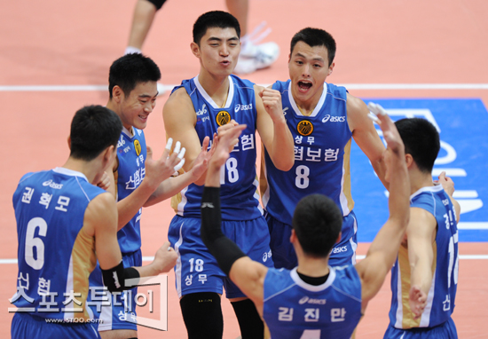 [인천=스포츠투데이 정재훈 기자] 22일 오후 인천 도원시립체육관에서 열린 'NH농협 2011-2012 V리그' 남자부 대한항공과 신협상무의 경기에서 득점에 성공한 상무 선수들이 환호하고 있다.스포츠투데이 정재훈 사진기자 roze@<ⓒ아시아경제 & 재밌는 뉴스, 즐거운 하루 "스포츠투데이(stoo.com)">정재훈 사진기자 roze@<ⓒ아시아 대표 석간 '아시아경제' (www.newsva.co.kr) 무단전재 배포금지>