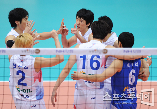 [인천=스포츠투데이 정재훈 기자] 22일 오후 인천 도원시립체육관에서 열린 'NH농협 2011-2012 V리그' 남자부 대한항공과 신협상무의 경기에서 영리한 플레이를 펼친 한선수를 향해 엄지손가락을 들어보이는 동료.스포츠투데이 정재훈 사진기자 roze@<ⓒ아시아경제 & 재밌는 뉴스, 즐거운 하루 "스포츠투데이(stoo.com)">정재훈 사진기자 roze@<ⓒ아시아 대표 석간 '아시아경제' (www.newsva.co.kr) 무단전재 배포금지>