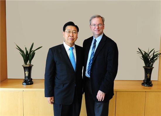 지난 8일 서울 대치동 포스코센터에서 비공개 면담을 가진 정준양 포스코 회장(왼쪽)과 에릭 슈미트 구글 회장이 기념 촬영하고 있다.