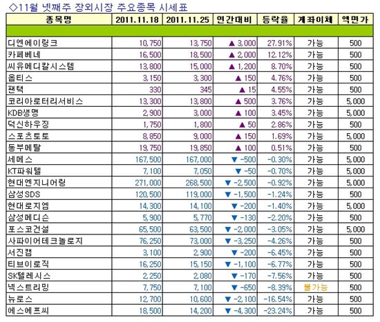 [아시아경제 천우진 기자] 38커뮤니케이션은 11월 넷째주 장외지수가 647.05를 기록해 전주대비 3.97포인트(0.61%) 하락했다고 27일 발표했다.기업공개(IPO) 관련주로는 오는 28일 코스닥 상장예정인 표준 플레이트 전문회사 신진에스엠이 1만8700원(+4.47%)으로 공모가 보다 3700원(+24.6%)오르며 장외마감했다. 다음달 6일 공모 예정인 심전도 감시기 생산업체 씨유메디칼시스템은 지난주 1만5000원(+8.70%)으로 올랐다. 다음달 14일 공모 예정인 융합유전체 대량분석 서비스기업 디엔에이링크도 한주간 1만3750원(+27.91%)으로 올라 주간 최고 상승률을 기록했다.하지만 이달 30일 코스닥 상장 예정인 플라스틱 필름 제조업체 에스에프씨는 1만4200원(-23.24%)으로 내려 주간 최고 하락률을 기록했다. 다음달 1일 코스닥 상장 예정인 방송용 모니터 생산업체 티브이로직과 다음달 2일 코스닥 상장 예정인 멀티미디어 솔루션업체 넥스트리밍도 지난주 각각 1만5150원(-6.77%), 7100원(-8.39%)으로 내렸다.지난 24일 300.33대1의 청약 경쟁률로 공모를 마감하고 다음달 5일 상장 예정인 사파이어 잉곳 생산업체 사파이어테크놀로지는 7만3000원(-4.26%)으로 밀려났다. 다음달 14일 공모 예정인 체인화 편의점업체 GS리테일은 한주간 2만6900원(-7.24%)으로 내렸다. 상장 승인 기업인 자이데나 생산업체 동아팜텍과 터보엔진 제조업체 뉴로스도 각각 3만2500원(-4.41%), 1만600원(-16.54%)으로 내렸다.심사 청구 기업으로 능동형유기발광다이오드(AMOLED) 제조장비업체 비아트론과 가공공작 기계 제작업체 제이엠씨중공업이 각각 1만7200원(+3.30%), 3750원(+7.14%)으로 상승했다. 반도체 테스트업체 테스나는 1만1850원(-6.69%)으로 하락했다.삼성 관련주로는 정보통신기술(ICT) 서비스기업 삼성SDS와 반도체 세정장비업체 세메스가 각각 11만9000원(-1.24%), 16만7000원(-0.30%)으로 내렸다. 홈 네트워크 전문기업 서울통신기술과 정보보안 솔루션업체 시큐아이닷컴은 지난주 각각 5만3750원(-0.46%), 1만150원(-3.33%)으로 밀려났다. 의료장비 제조업체 삼성메디슨은 5770원(-2.20%)으로 하락했다.카페베네(+12.12%), 디비티(+10.00%), 옵티스(4.76%), 티맥스소프트(+4.72%), 팬택(4.55%)등은 지난주 상승했다. 시그넷시스템(-15.25%), SK텔레시스(-7.56%), 서진캠(-6.45%), 포스코건설(-3.05%), 현대카드(-2.80%)등은 지난주 약세였다.자료제공: