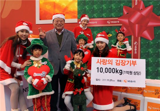 ▲27일 청계 광장에서 도상철 NS 홈쇼핑 대표이사(사진 왼쪽에서 세번째) 등 임직원 200여 명이 참가한 가운데 ‘김장나눔축제’를 통해 시민들로부터 기부 받은 나눔 김장김치 1만kg, 1억원 상당을 한국어린이재단과 성남수정복지관에 전달하는 행사를 진행했다.