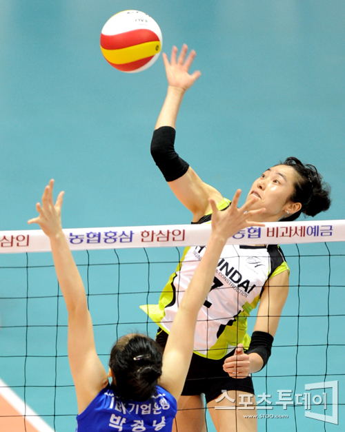 [수원=스포츠투데이 정재훈 기자] 30일 오후 수원실내체육관에서 열린 'NH 농협 2011-2012 V리그' 여자부 현대건설과 IBK 기업은행의 경기에서 현대건설 윤혜숙이 스파이크를 때리고 있다.스포츠투데이 정재훈 사진기자 roze@<ⓒ아시아경제 & 재밌는 뉴스, 즐거운 하루 "스포츠투데이(stoo.com)">정재훈 사진기자 roze@<ⓒ아시아 대표 석간 '아시아경제' (www.newsva.co.kr) 무단전재 배포금지>