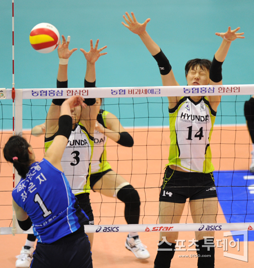[수원=스포츠투데이 정재훈 기자] 30일 오후 수원실내체육관에서 열린 'NH 농협 2011-2012 V리그' 여자부 현대건설과 IBK 기업은행의 경기에서 염혜선과 양효진이 최은지의 스파이크를 블로킹하기 위해 뛰어오르고 있다.스포츠투데이 정재훈 사진기자 roze@<ⓒ아시아경제 & 재밌는 뉴스, 즐거운 하루 "스포츠투데이(stoo.com)">정재훈 사진기자 roze@<ⓒ아시아 대표 석간 '아시아경제' (www.newsva.co.kr) 무단전재 배포금지>