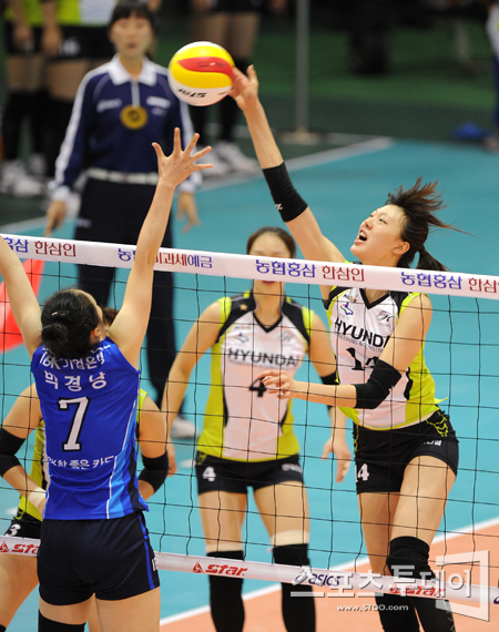 [수원=스포츠투데이 정재훈 기자] 30일 오후 수원실내체육관에서 열린 'NH 농협 2011-2012 V리그' 여자부 현대건설과 IBK 기업은행의 경기에서 양효진이 스파이크를 때리고 있다.스포츠투데이 정재훈 사진기자 roze@<ⓒ아시아경제 & 재밌는 뉴스, 즐거운 하루 "스포츠투데이(stoo.com)">정재훈 사진기자 roze@<ⓒ아시아 대표 석간 '아시아경제' (www.newsva.co.kr) 무단전재 배포금지>