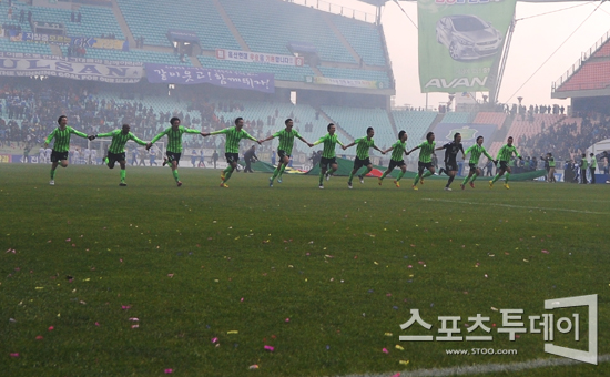 [전주=스포츠투데이 정재훈 기자] 전북 현대 모터스가 2011년 K리그 챔피언의 자리에 올랐다. 전북은 4일 오후 전주월드컵경기장에서 열린 '현대 오일뱅크 K리그 2011' 챔피언결정전 2차전에서 루이스의 결승골로 2:1 승리를 거두며 K리그 우승 트로피를 들어올렸다. 스포츠투데이 정재훈 사진기자 roze@<ⓒ아시아경제 & 재밌는 뉴스, 즐거운 하루 "스포츠투데이(stoo.com)">